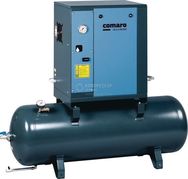 Винтовой компрессор COMAROLB 2,2/200 на ресивере компактен, прост в эксплуатации. Компрессоры с ременным приводом мощностью 2,2 кВт серия LB являются отличным решением для предприятий малого и среднего бизнеса в условиях ограниченного пространства для установки оборудования. Компрессоры имеют необходимые элементы управления для контроля рабочего давления и счетчик моточасов.